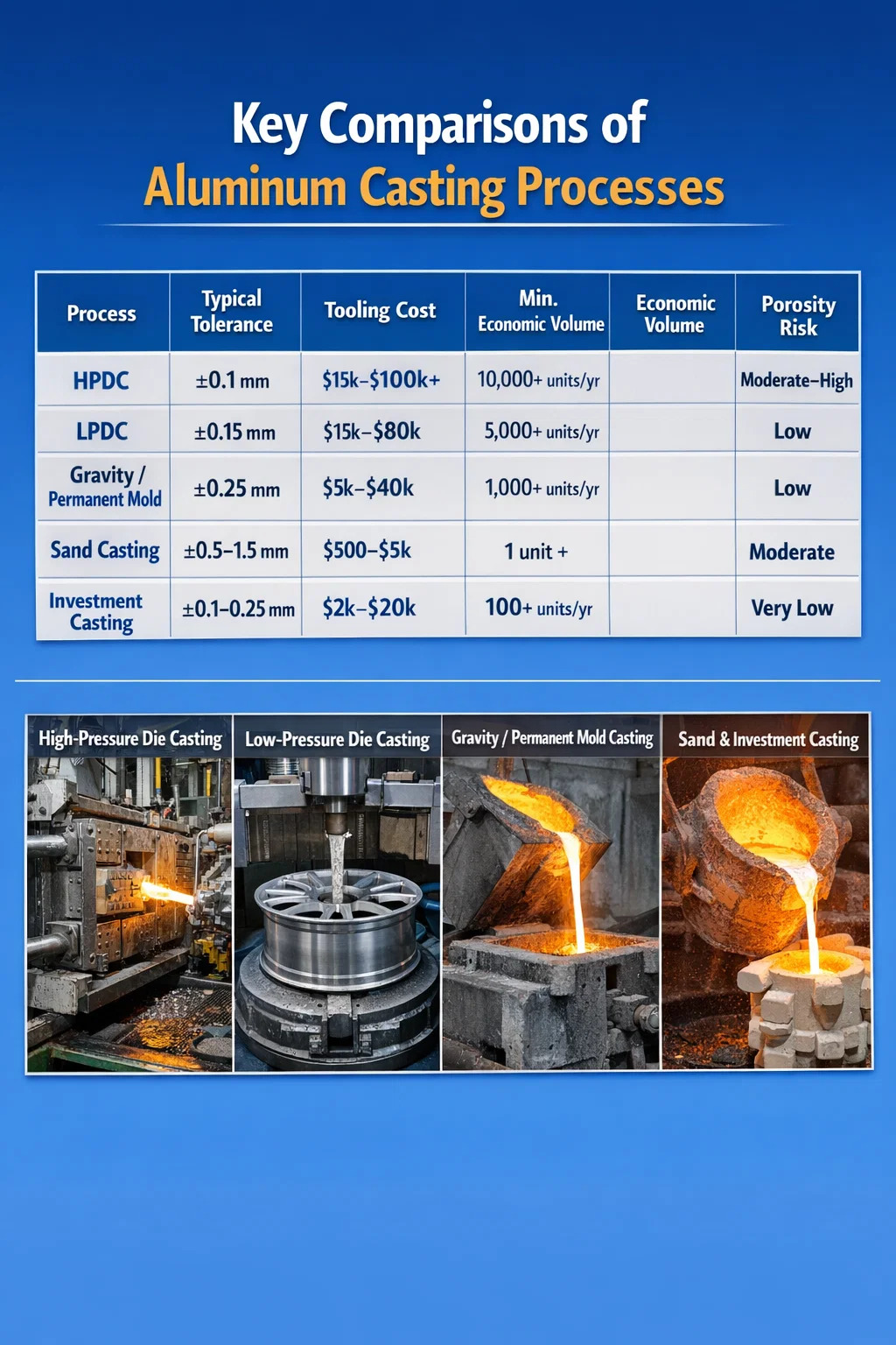 Alla aluminiumgjutningsmetoder är inte utbytbara. Varje process har en distinkt kostnadsprofil, ledtid för verktyg, dimensionsförmåga och ytfinishintervall. Att välja fel process kan lägga till 30–60 % till kostnaden per del eller pressa dimensionstoleranser utanför acceptabla gränser.