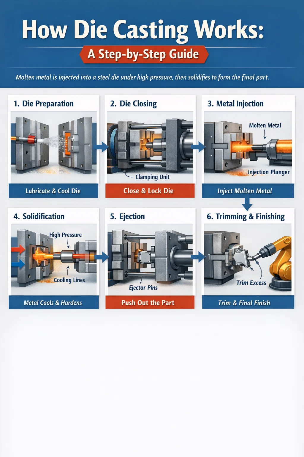 För att förstå hur pressgjutning går till krävs att man går igenom varje steg i produktionscykeln. Medan olika maskiner och legeringar introducerar variationer, är den grundläggande sekvensen konsekvent inom branschen.