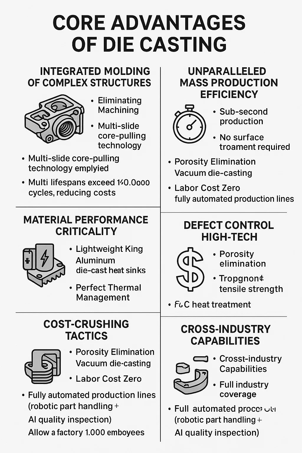 Endelade gjutningscykeltider på 10-60 sekunder (upp till 30 delar per minut för zinklegeringsdelar), med en produktionskapacitet 24/7 på 10.000 delar.