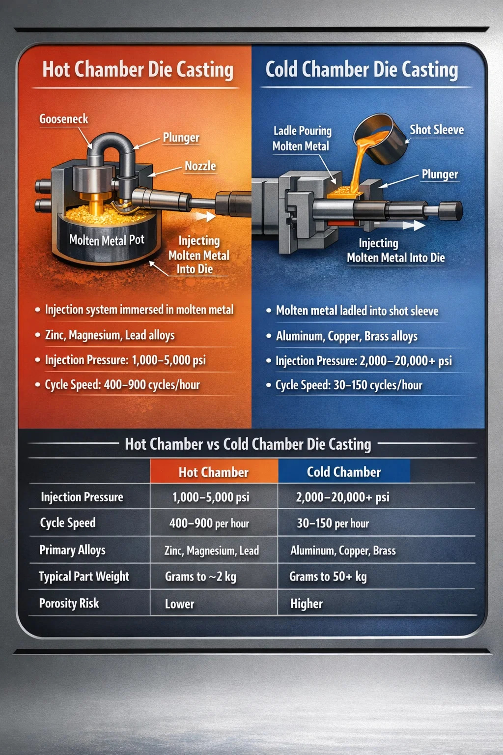 De två grundläggande metoderna för pressgjutning är varmkammarpressgjutning and kallkammarpressgjutning . Dessa två processer delar samma grundläggande mål - att tvinga in smält metall i en härdad stålform under högt tryck för att producera exakta, repeterbara delar - men de skiljer sig avsevärt i hur metallen smälts, hanteras och injiceras. Att välja fel metod för din legerings- eller delgeometri kan resultera i dålig fyllning, överdriven porositet, för tidigt slitage och kostsamma skrotningshastigheter. Att förstå vad som skiljer dessa två metoder är utgångspunkten för alla seriösa pressgjutningsbeslut.
