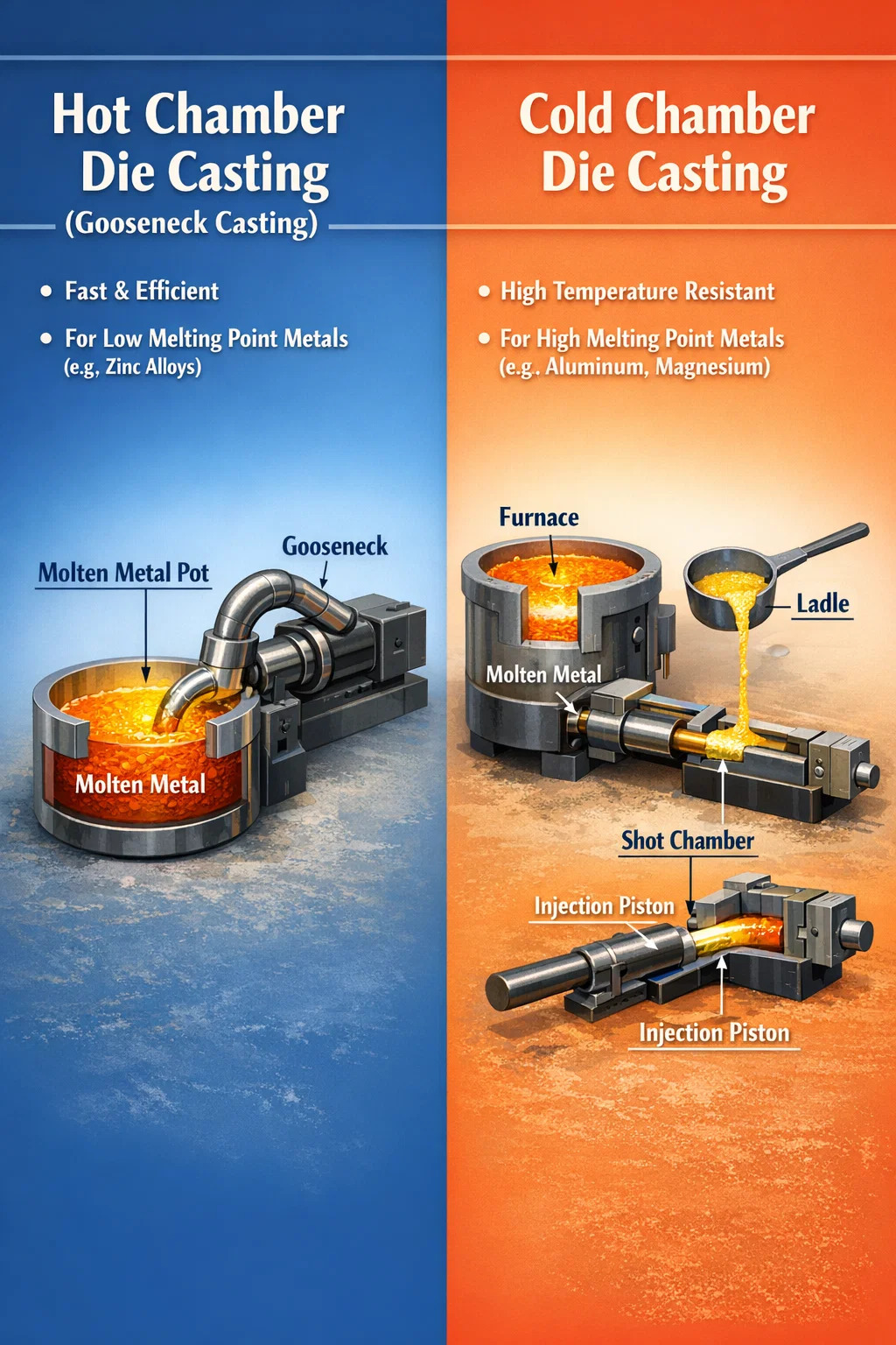 I världen av pressgjutning , det finns två huvudkategorier baserade på hur metallen smälts och injiceras i formen: varmkammarpressgjutning och kallkammarpressgjutning.
