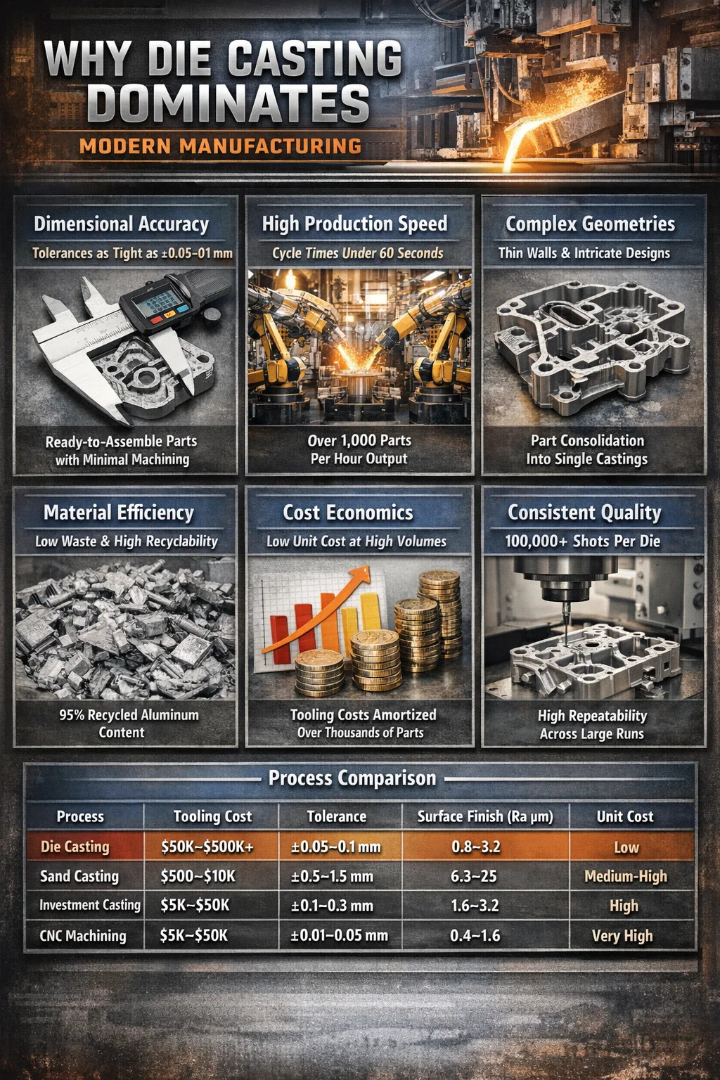 Men när verktygskostnaden har skrivits av över en tillräcklig produktionsvolym - vanligtvis 20 000 till 50 000 delar eller mer - sjunker kostnaden per enhet för pressgjutning långt under alternativen. Kombinationen av snabba cykeltider, minimalt arbete per del, låga skrothastigheter och minskad sekundär drift skapar en enhetsekonomisk profil som konkurrerande processer inte kan matcha i volym.