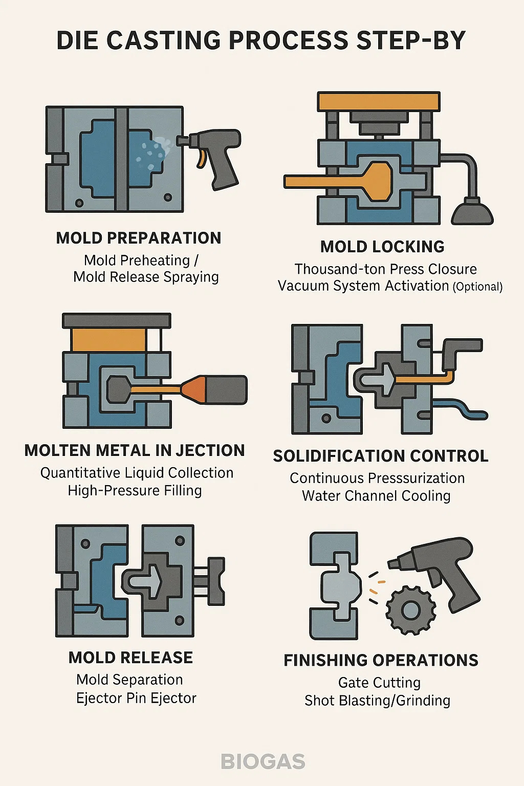 Högtrycksfyllning: En kolv injicerar smält aluminium i mögelhålan vid kanonbollshastighet (30-100 m/s) och fyller kaviteten inom 0,01-0,3 sekunder.