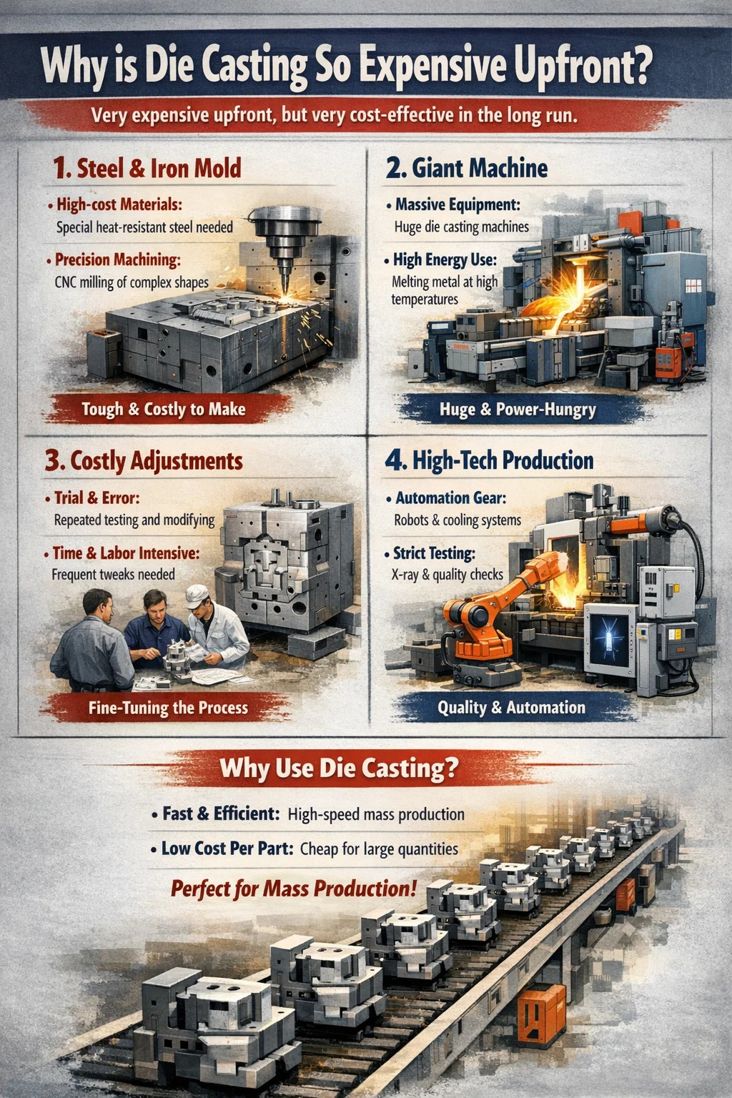 Faktum är att pressgjutning är verkligen en process som är "mycket dyr i förväg, men mycket kostnadseffektiv i det långa loppet." Dess höga kostnad återspeglas främst i den initiala investeringen. Vi kan bryta ner denna process:
