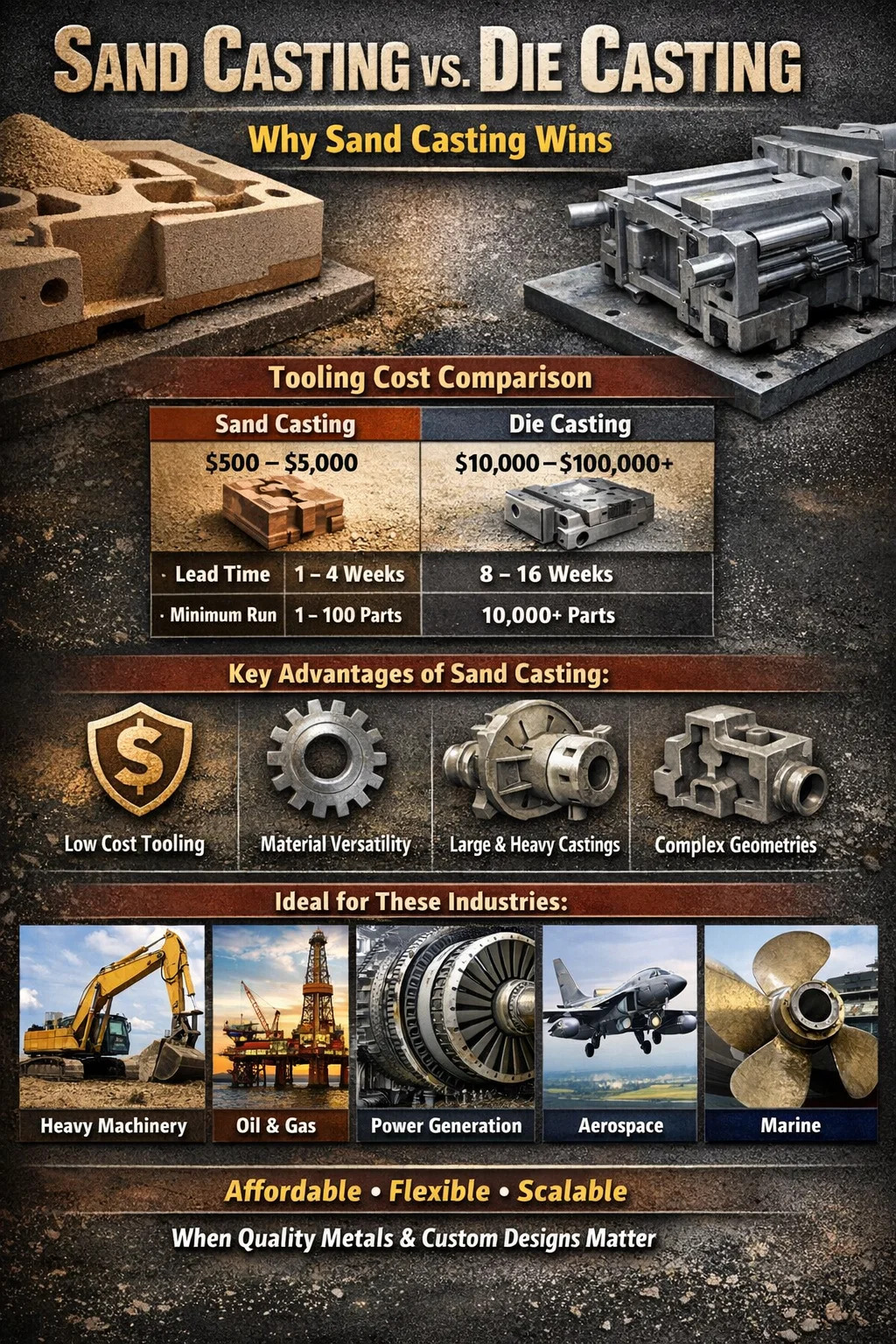 Det korta svaret: Sandgjutning vinner på kostnad, flexibilitet och skala